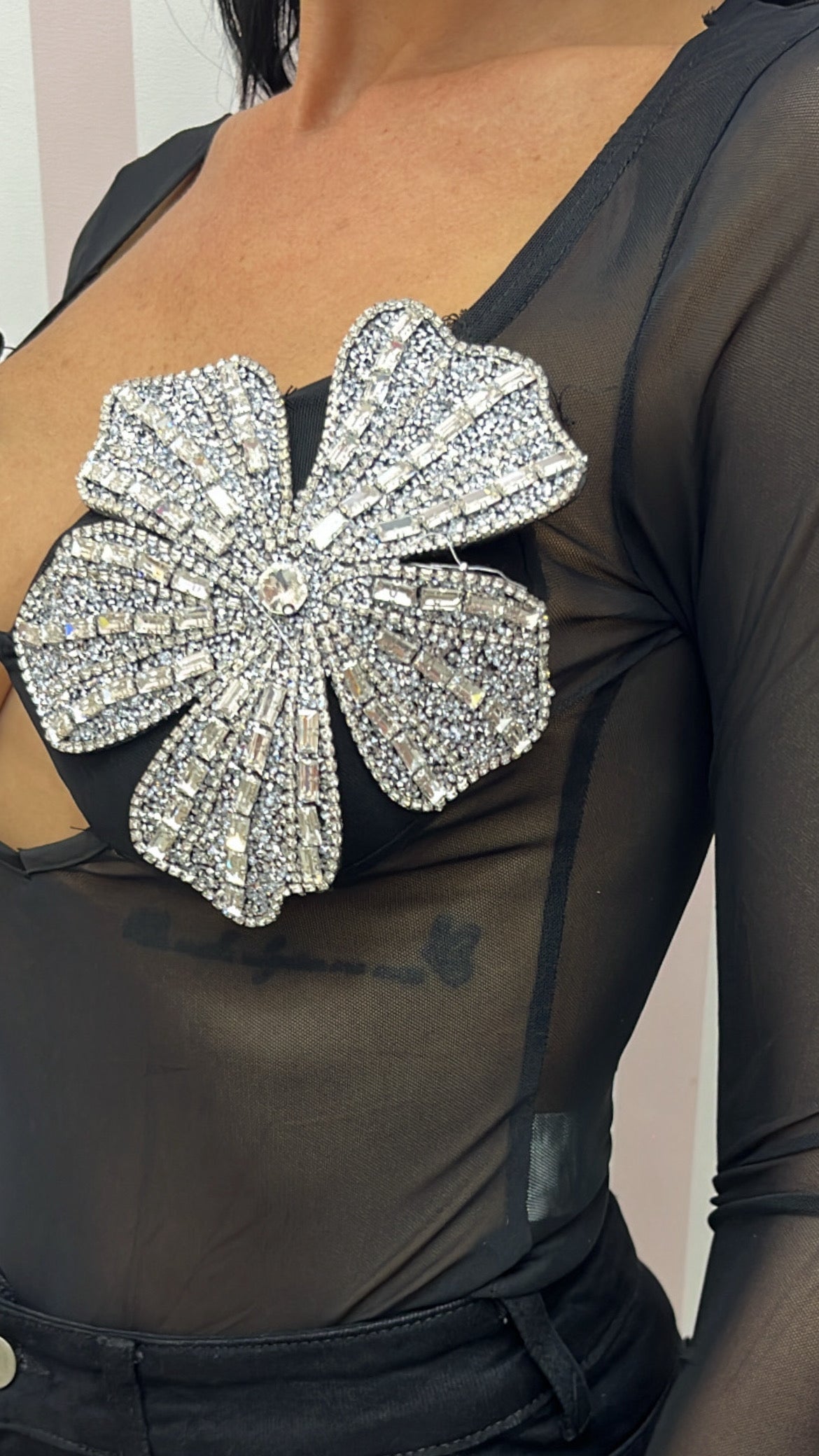 Per il tuo look super glamour ti consiglio questo body con dettagli fiore impreziosito da strass consigliato anche con un jeans e in taglia unica ma vestibilità perfetta da tg S a L