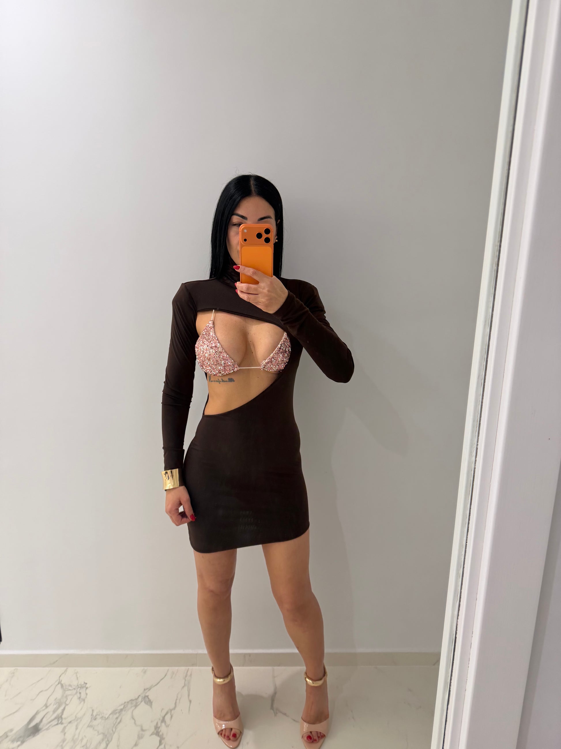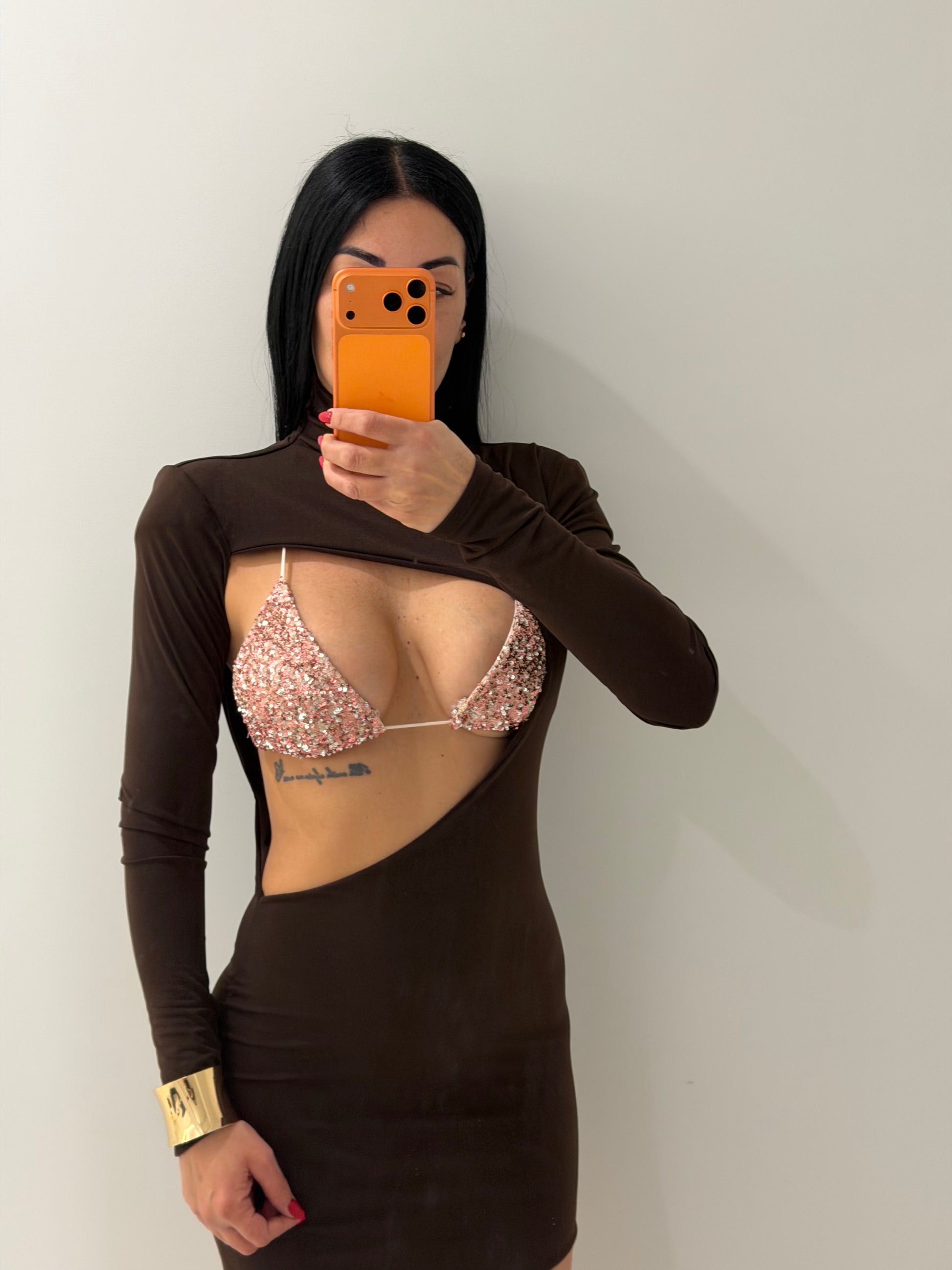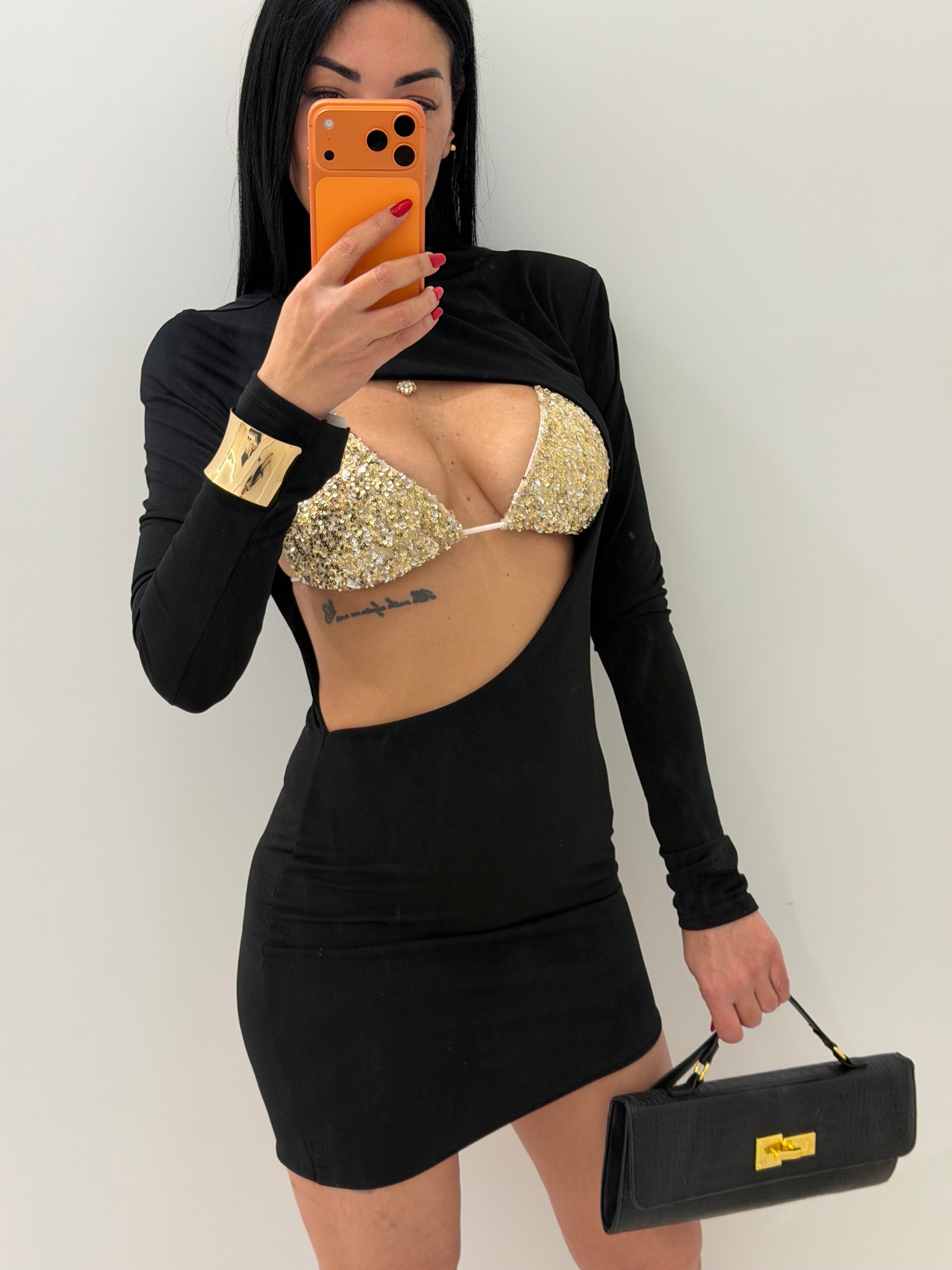 Abito bellissimo tessuto elastico con spalline dettagli bralette (bikini) brillantinato in taglia unica ma vestibilità comoda da tg XS a L nota bene la bralette veste fino ad una terza di seno