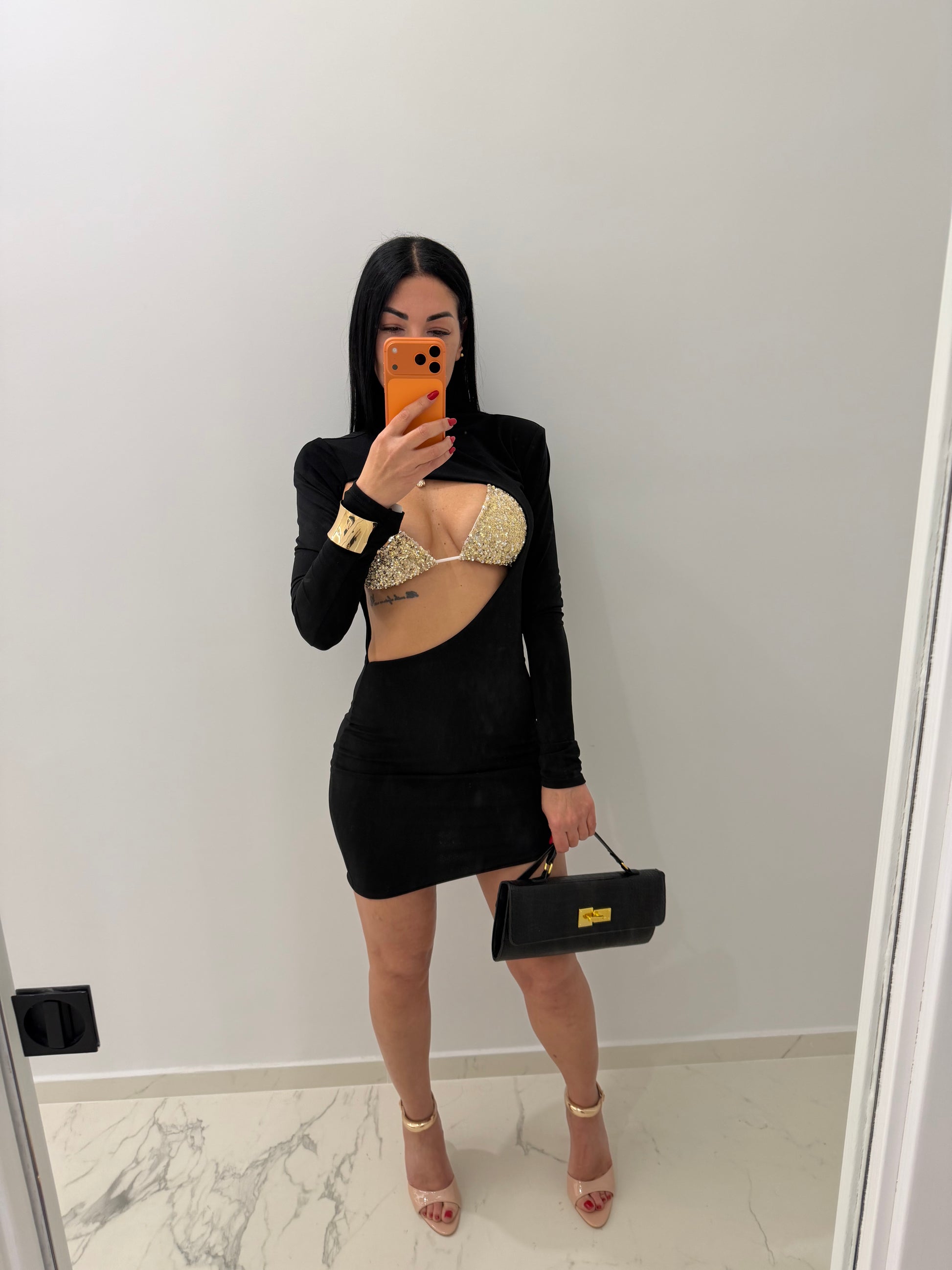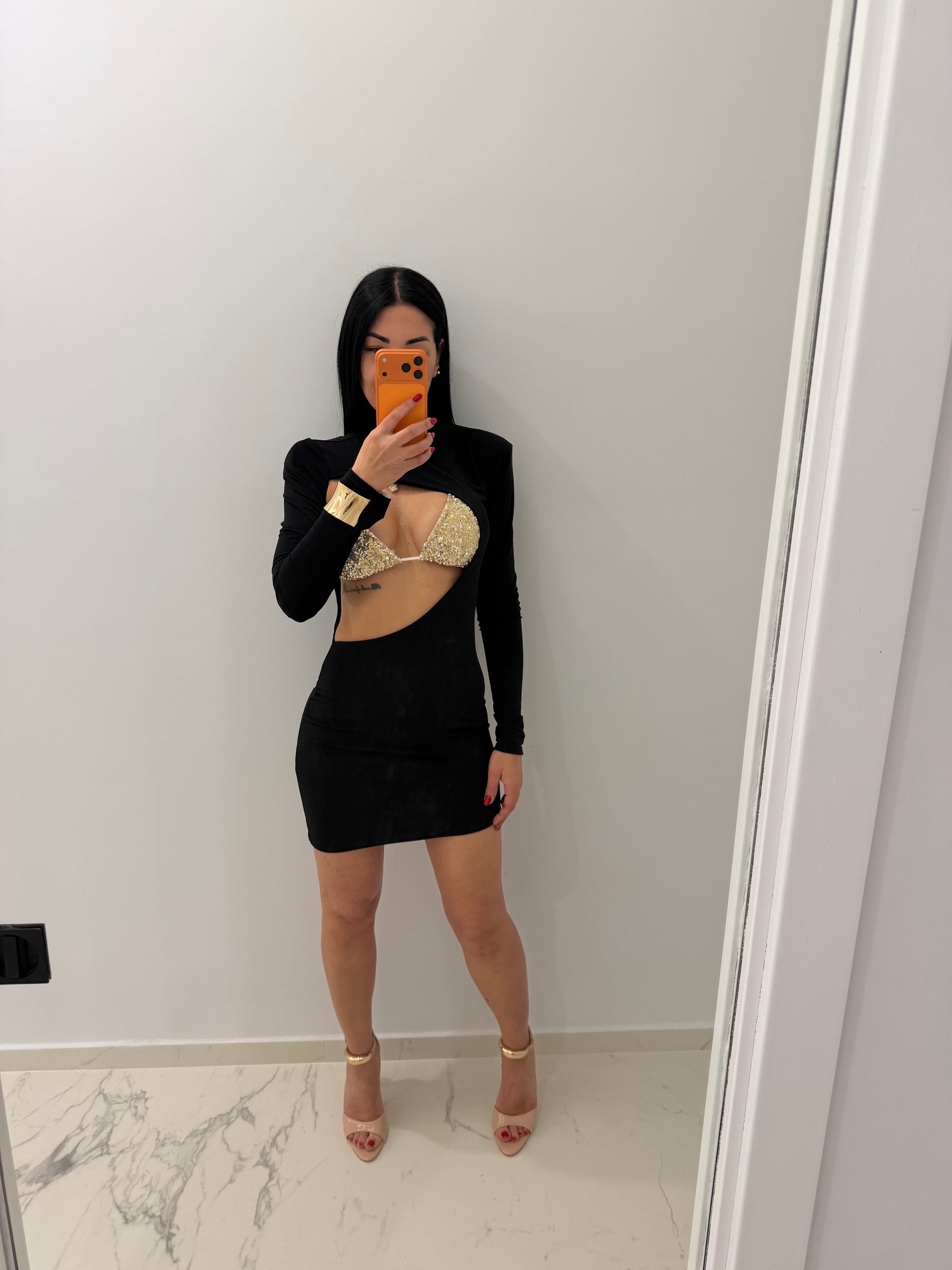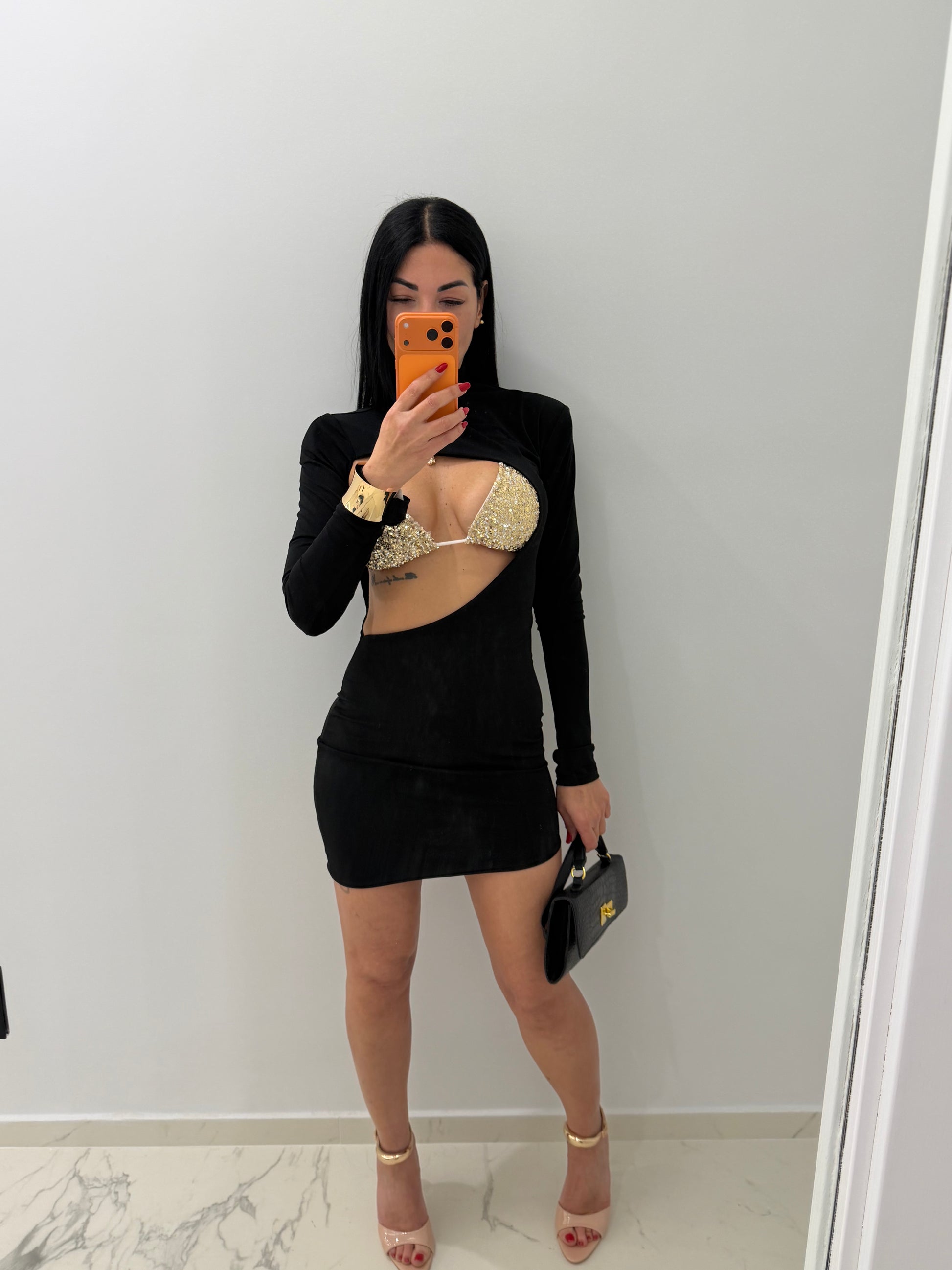 Abito bellissimo tessuto elastico con spalline dettagli bralette (bikini) brillantinato in taglia unica ma vestibilità comoda da tg XS a L nota bene la bralette veste fino ad una terza di seno
