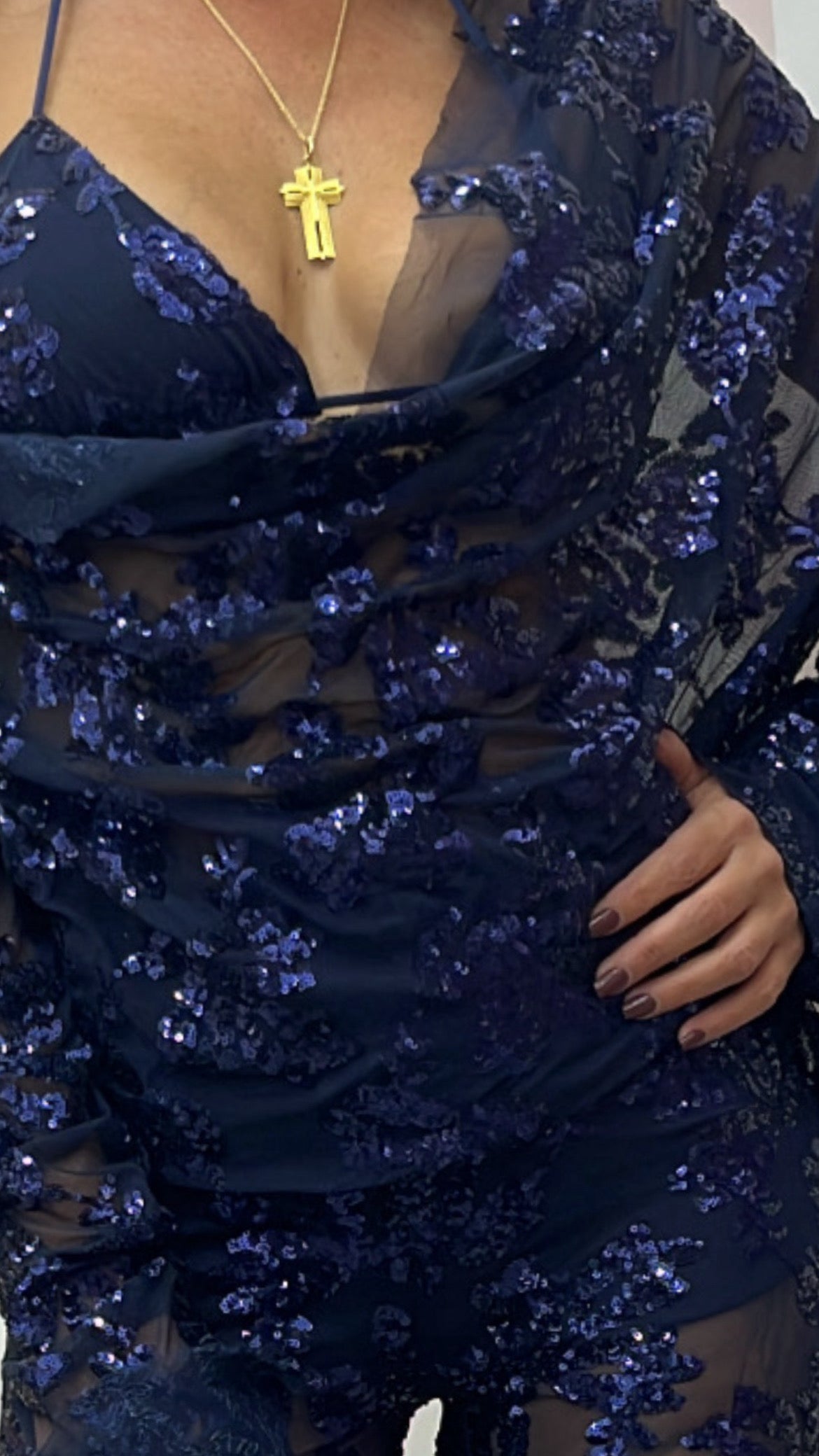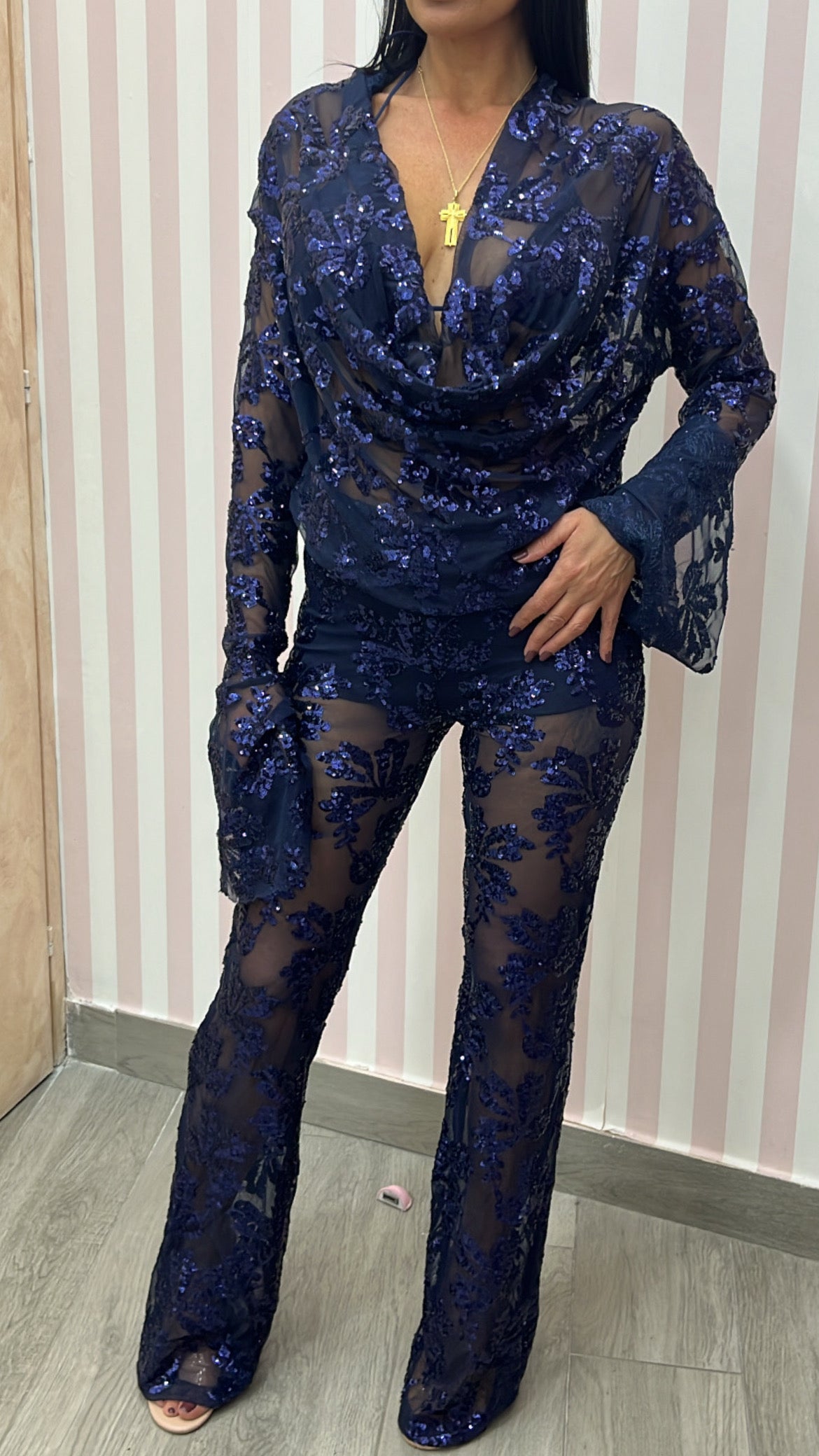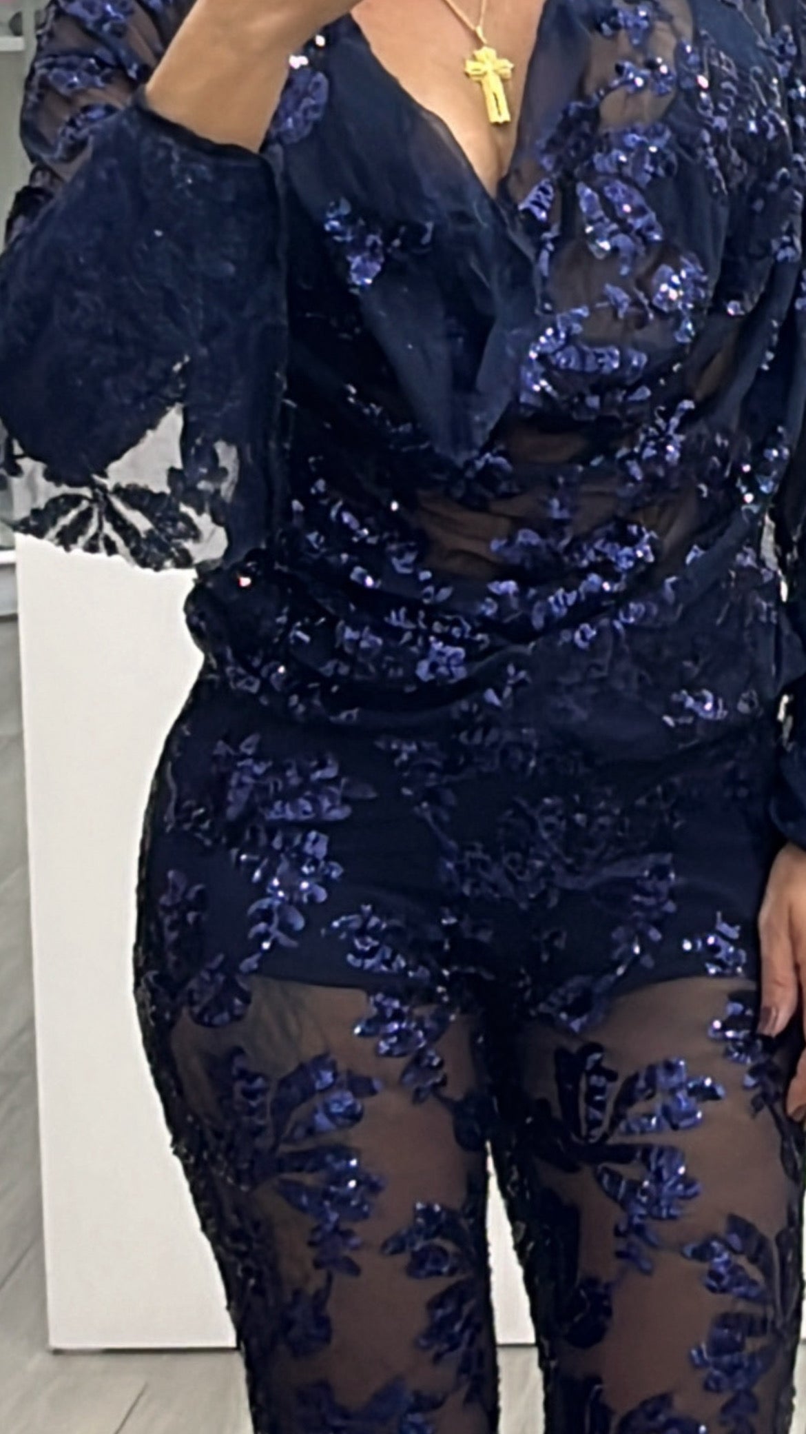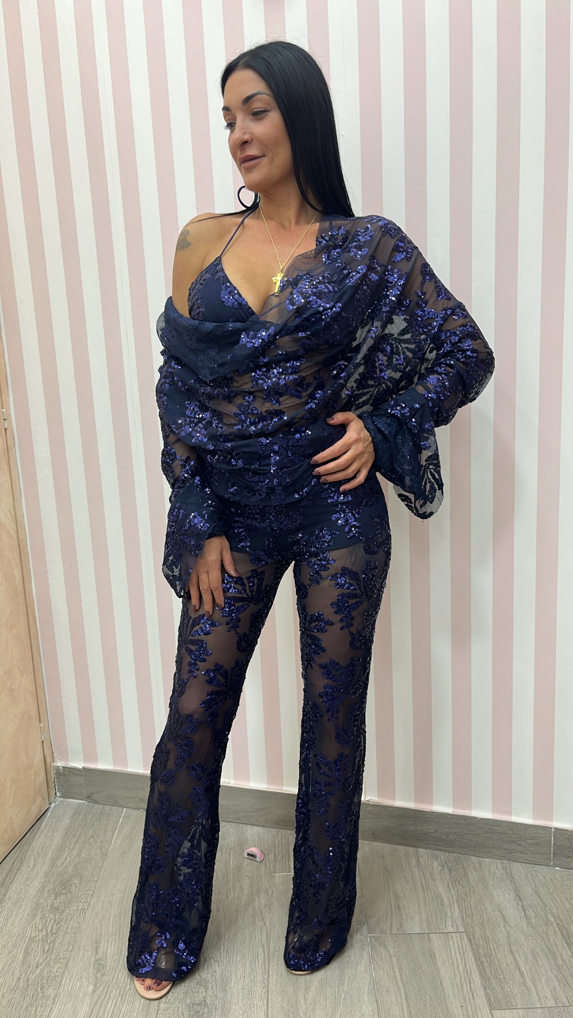 Vi mostro un set super particolare consigliato per i vostri eventi eleganti e per essere particolarmente diverse dal solito si presenta con pantalone con culotte inclusa top bikini blusa tessuto con applicazioni semi luccicoso in taglia unica