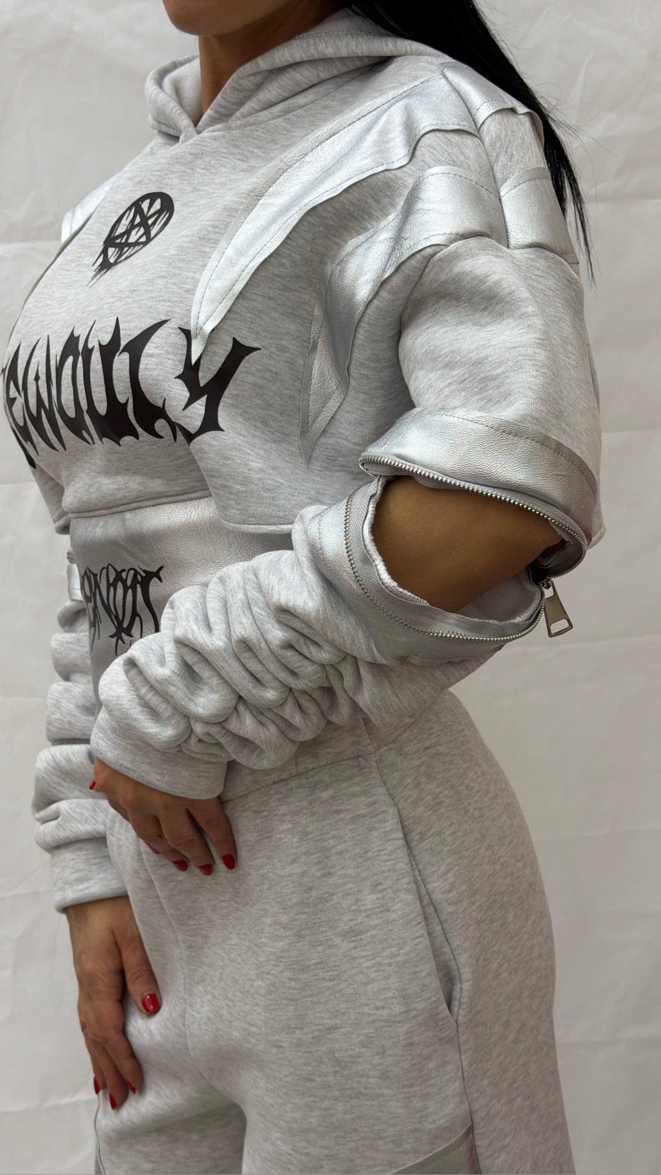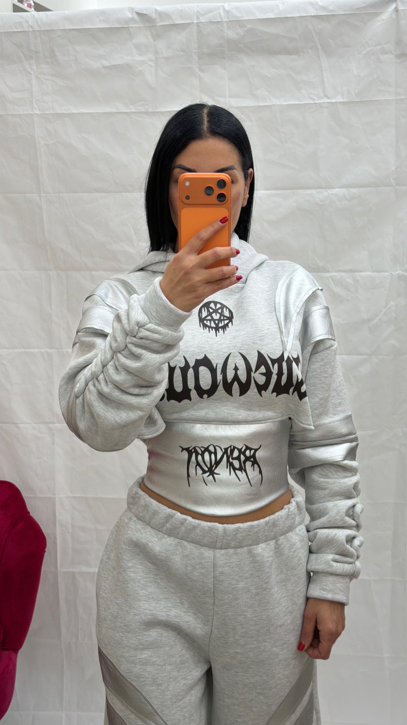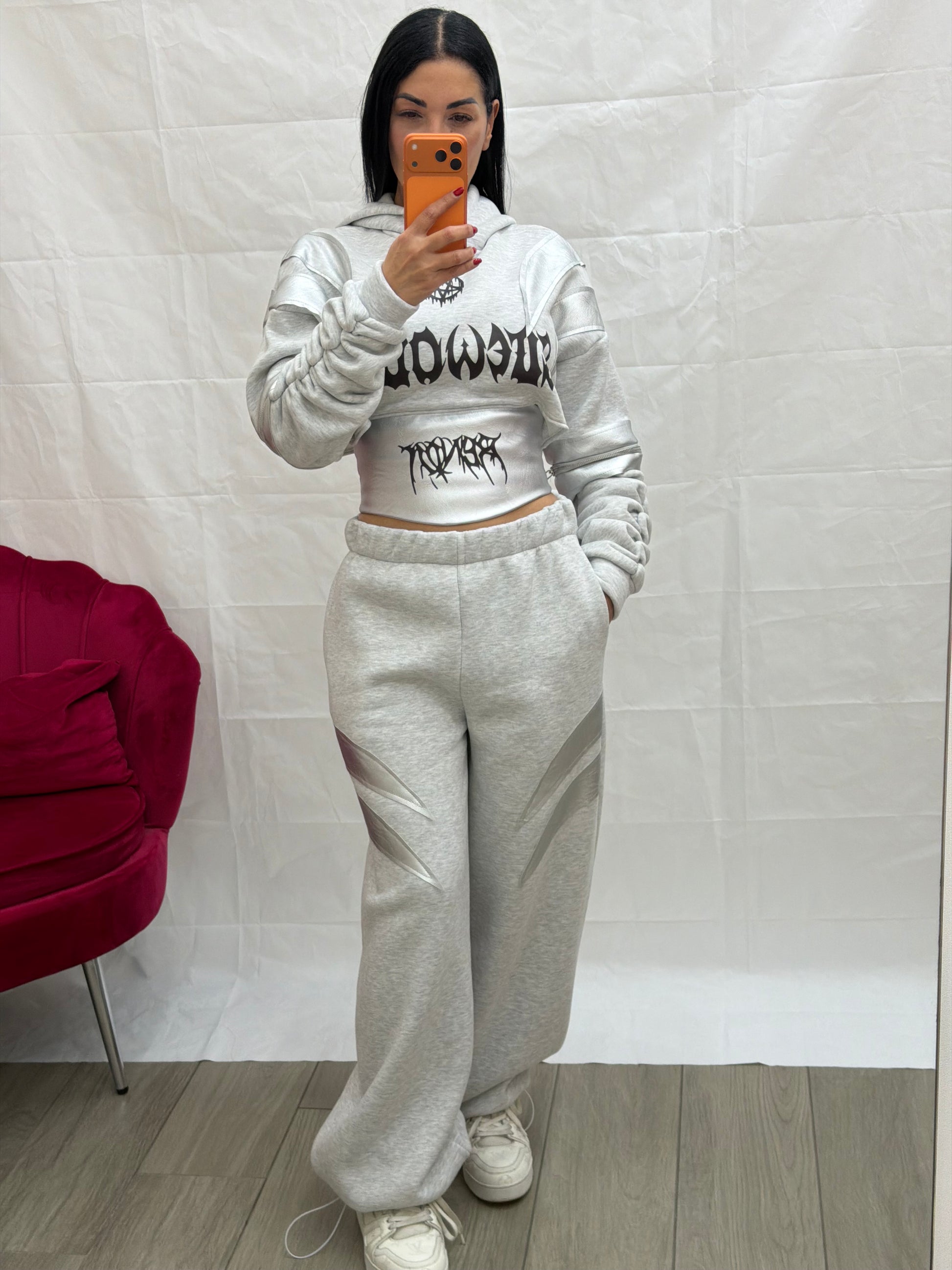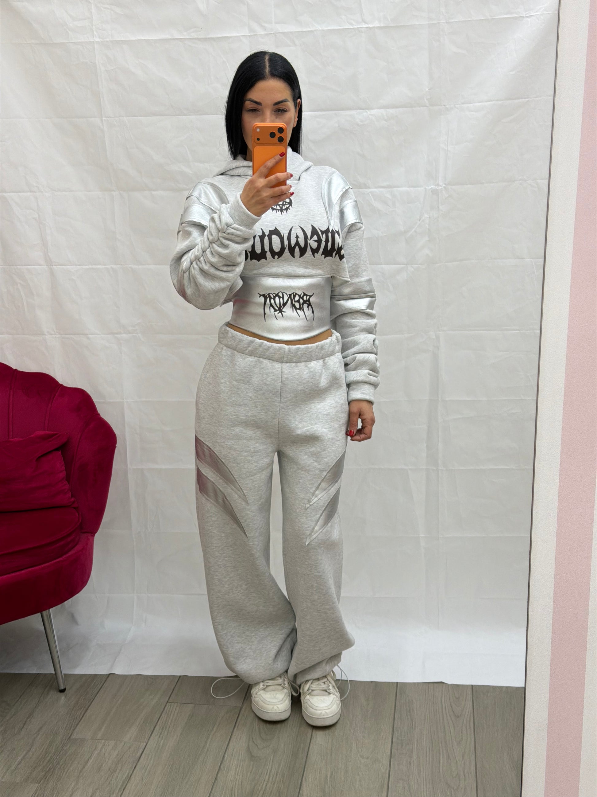 Tuta super particolare felpata con dettagli retro mixato dal grigio con argento pantalone con coulisse zip sul braccio consigliata in taglia unica ma vestibilità comoda da tg XS a L
